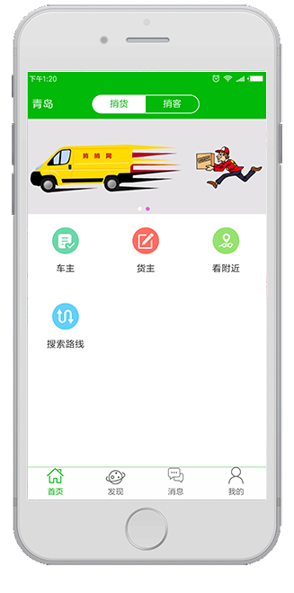 车主或货主均可以发布信息,也可以搜索附近车辆或货物,然后进行抢单